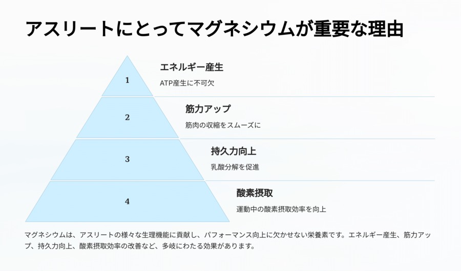 近年、激しい運動を行うアスリートにとって、マグネシウムはパフォーマンス向上や健康維持に欠かせない栄養素として注目されています。